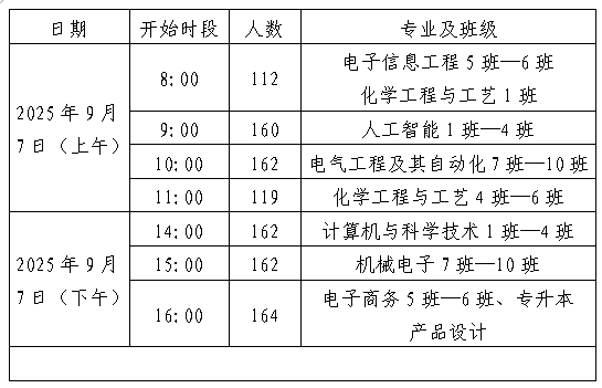 一、体检时间:2025年9月7日(星期日)上午8:00-11:30,下午14:00-17:00,各专业学生体检具体时间详见附表。