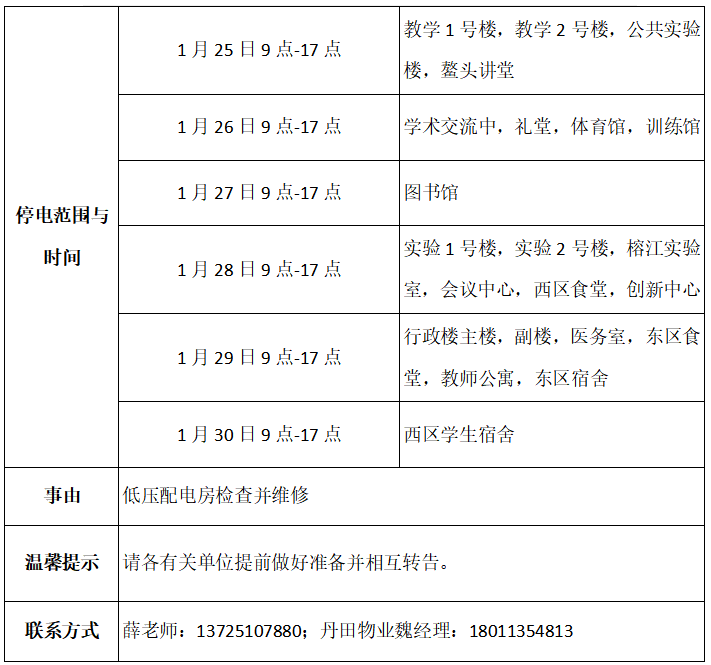 根据检修工作需要,现将揭阳校区停电计划通知如下: