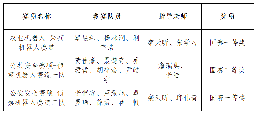 其中“农业机器人——采摘赛道”全国各赛区共有57支队伍入围总决赛,经过两天的激烈角逐,队员凭借过硬的技术与丰富的临场经验斩获国家一等奖,值得一提的是邦创无限战队是现场唯一一支应邀进行现场避障表演的参赛队伍。“公共安全——侦察机器人赛道”两队队员均通过排位赛进入最后一轮决赛,队员们深入研发依靠视觉侦查的自主巡逻机器人、保障高危场景下完成任务需求,探讨技术方案,从软硬件两方面着手布置技战术,分别获得国赛一等奖和国赛二等奖!
